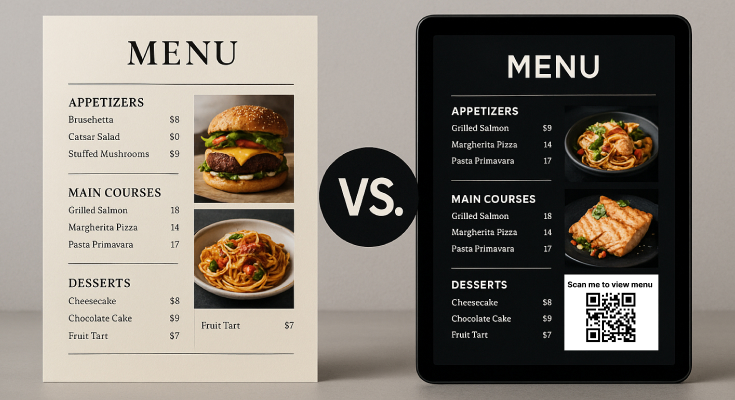 On the other hand, digital menus offer flexibility, quick updates, and better cost savings over time. They support features like QR code access, online ordering, and multilingual options.